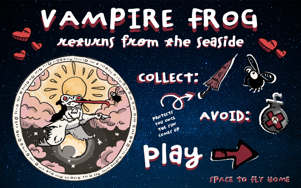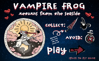 Vampire Frog is a side scrolling game, where the player must avoid obstacles and collect power ups to protect them from the rising sun - or risk being burnt to a crisp